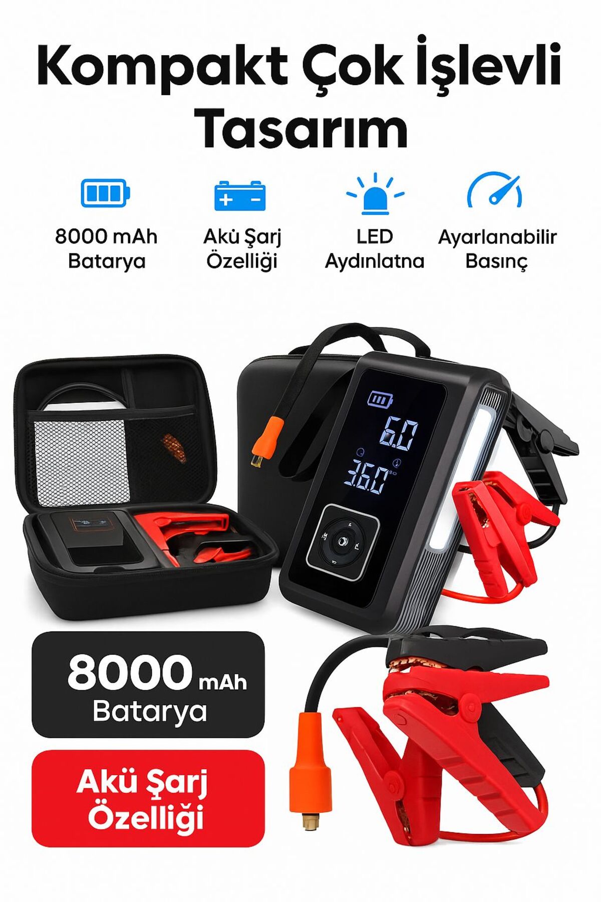 ⚡ Akü Takviye(12 V) – 1500 A’lik marş desteğiyle otomobilinizi anında çalıştırın Yol yardım setinizin olmazsa olmazı bu 4 ’ü 1 arada cihazla asla yarı yolda kalmayın! Kablosuz hızlı lastik pompası özelliği sayesinde sadece dakikalar içinde otomobil, motosiklet veya bisiklet lastiklerinizi 150 PSIbasınca ulaştırın.