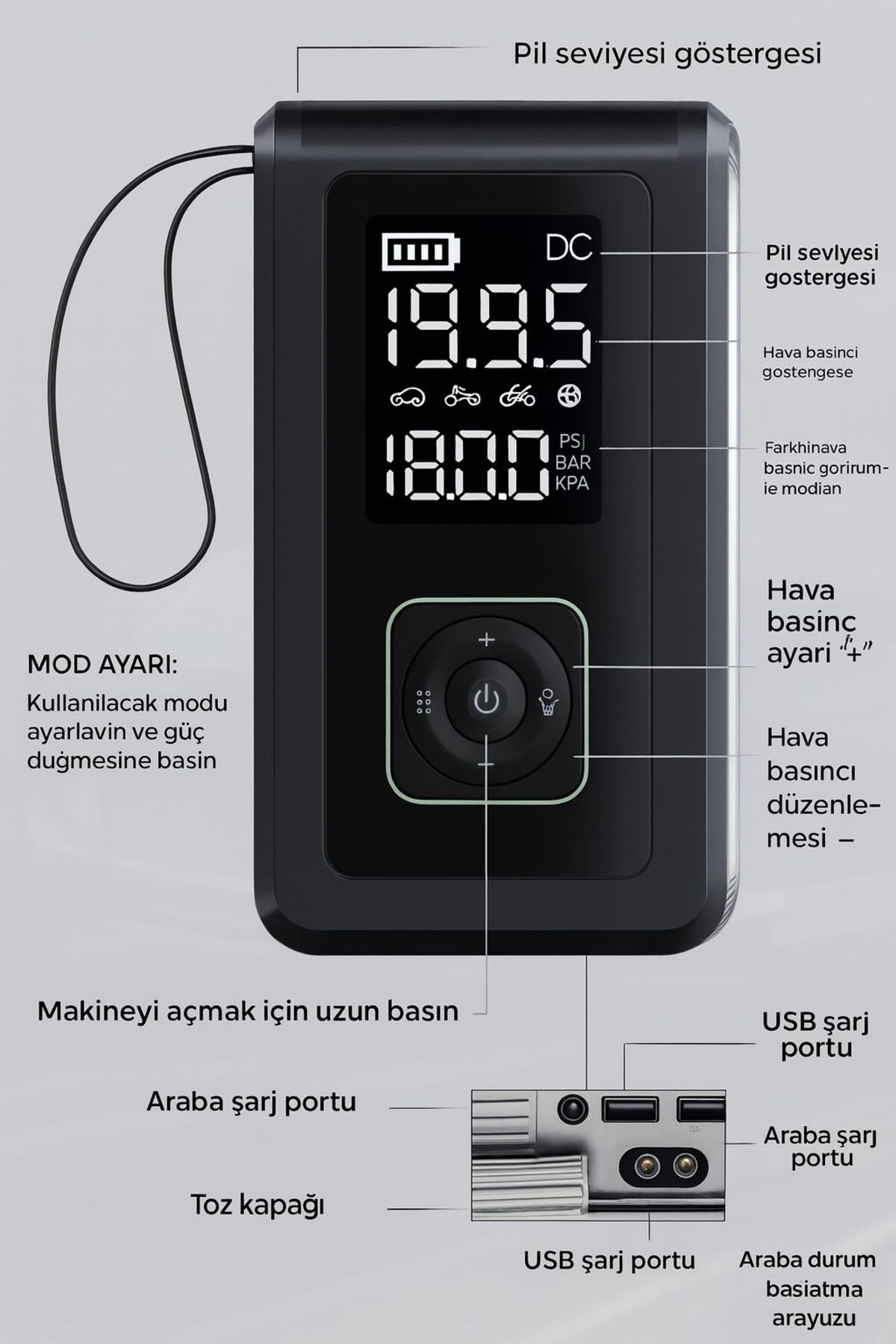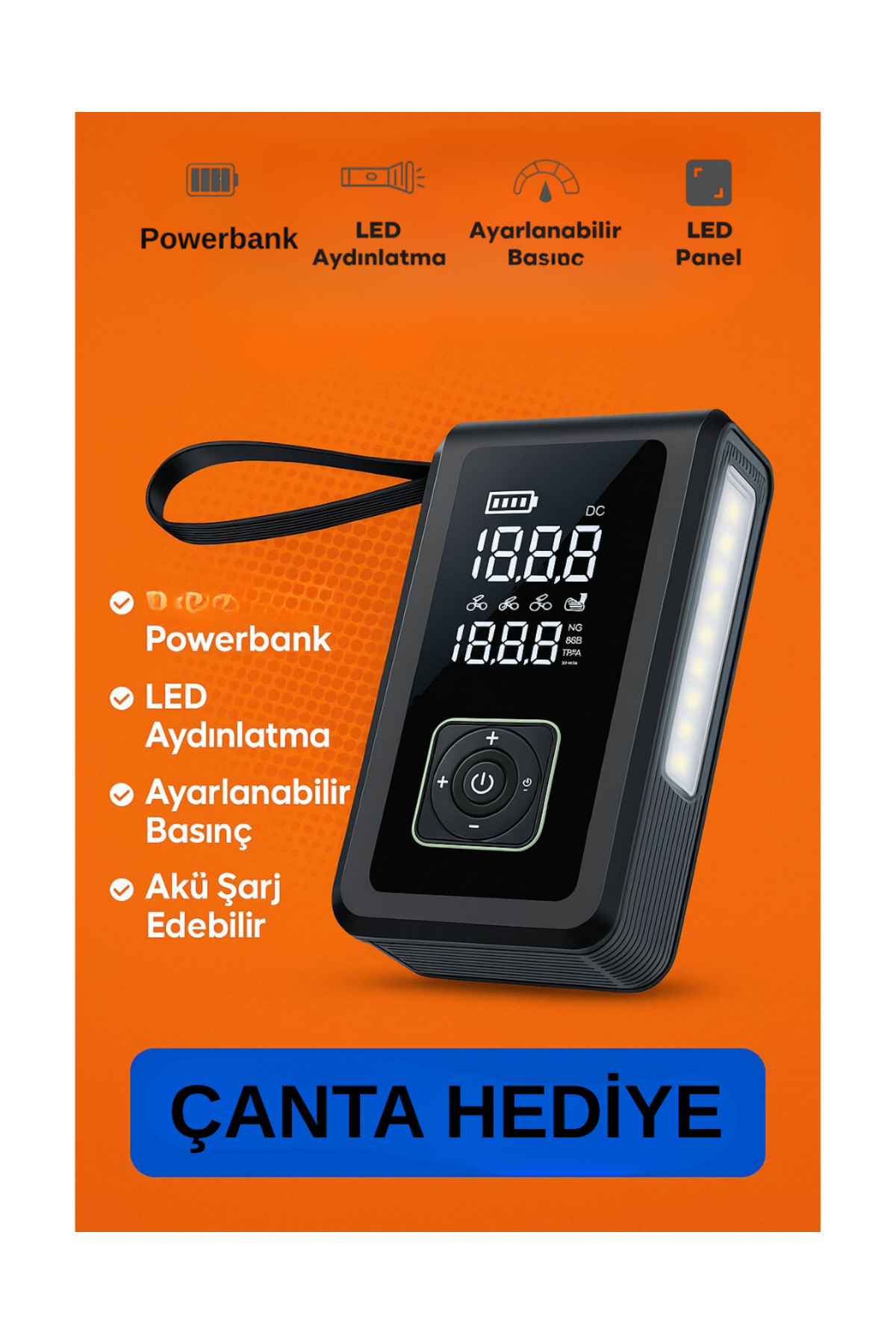 💨 Kablosuz Hava Pompası(150 PSI) – Araç, bisiklet ve spor topları için ideal ⚡ Akü Takviye(12 V) – 1500 A’lik marş desteğiyle otomobilinizi anında çalıştırın 🔋 Powerbank– 2× USB çıkış (5 V/2 A & 5 V/2.4 A), 1× Type-C girişi (5 V/2 A) 💡 LED Işıklıve LCD Ekranlı– Basınç ölçümünü hassas ve net okuyun Neden Bu Cihaz? Taşınabilir Kompresör: Araç bagajında az yer kaplar, her an kullanılmaya hazır Çok Fonksiyonlu Akü Takviye: Soğuk havalarda ve acil durumlarda hayat kurtarır Powerbank & Şarj Cihazı: Yolda priz aramadan tüm mobil cihazlarınızı hızlıca doldurun Kullanıcı Dostu: Dijital LCD ekran ve tek tuşla kolay kullanım kablosuz lastik pompası, hızlı hava kompresör, akü takviye cihazı, taşınabilir powerbank, 150 PSI pompa, LED ışıklı pompa, LCD ekranlı kompresör, USB şarjlı powerbank, çok fonksiyonlu araç aksesuarı.