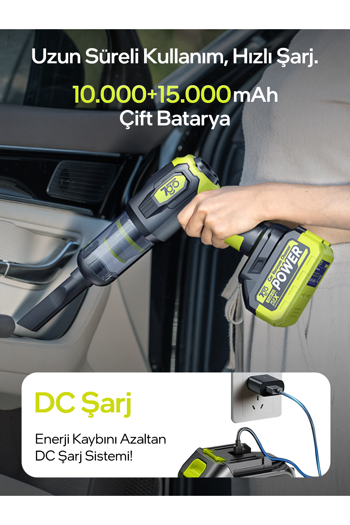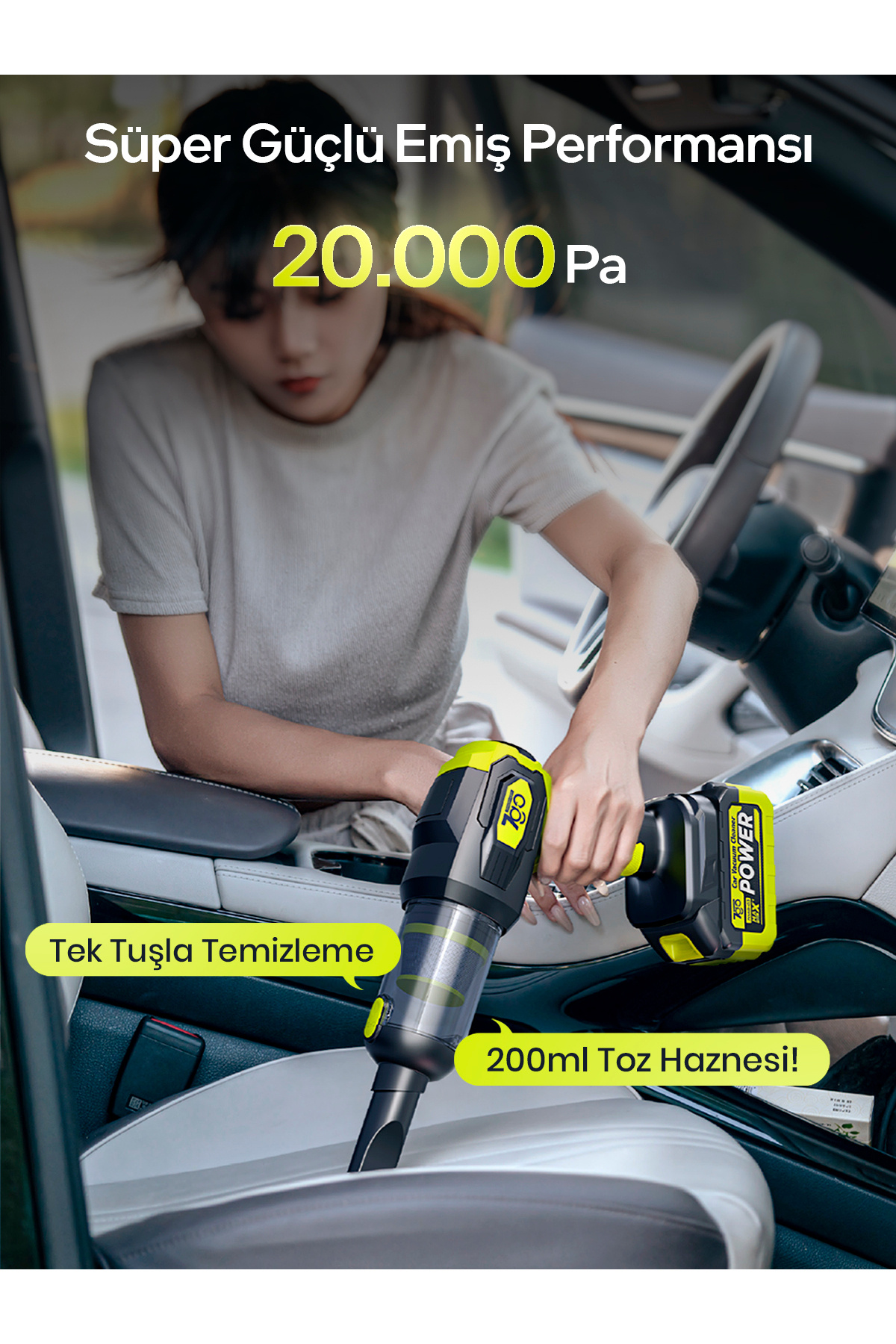 EMEK Kablosuz Araç İçi Süpürge, 20.000PA’lık ultra güçlü emiş gücü ve 90.000RPM motor teknolojisi ile aracınızdan evinize kadar her ortamda toz, kir ve saç gibi zorlu kalıntıları saniyeler içinde yok eder.