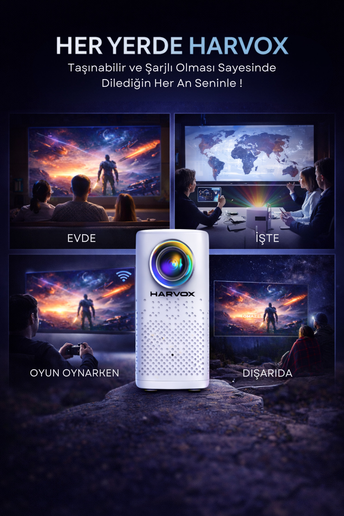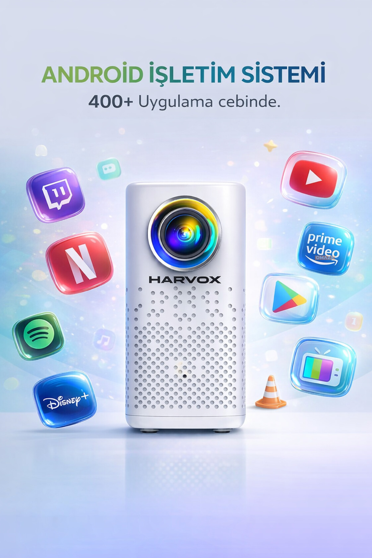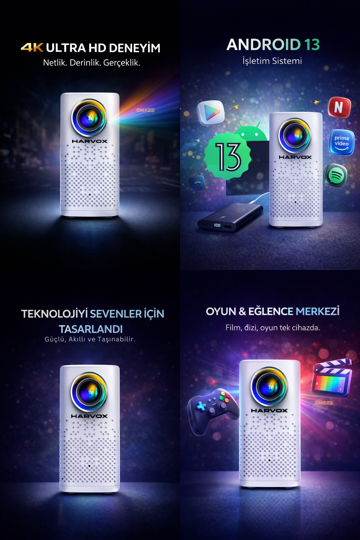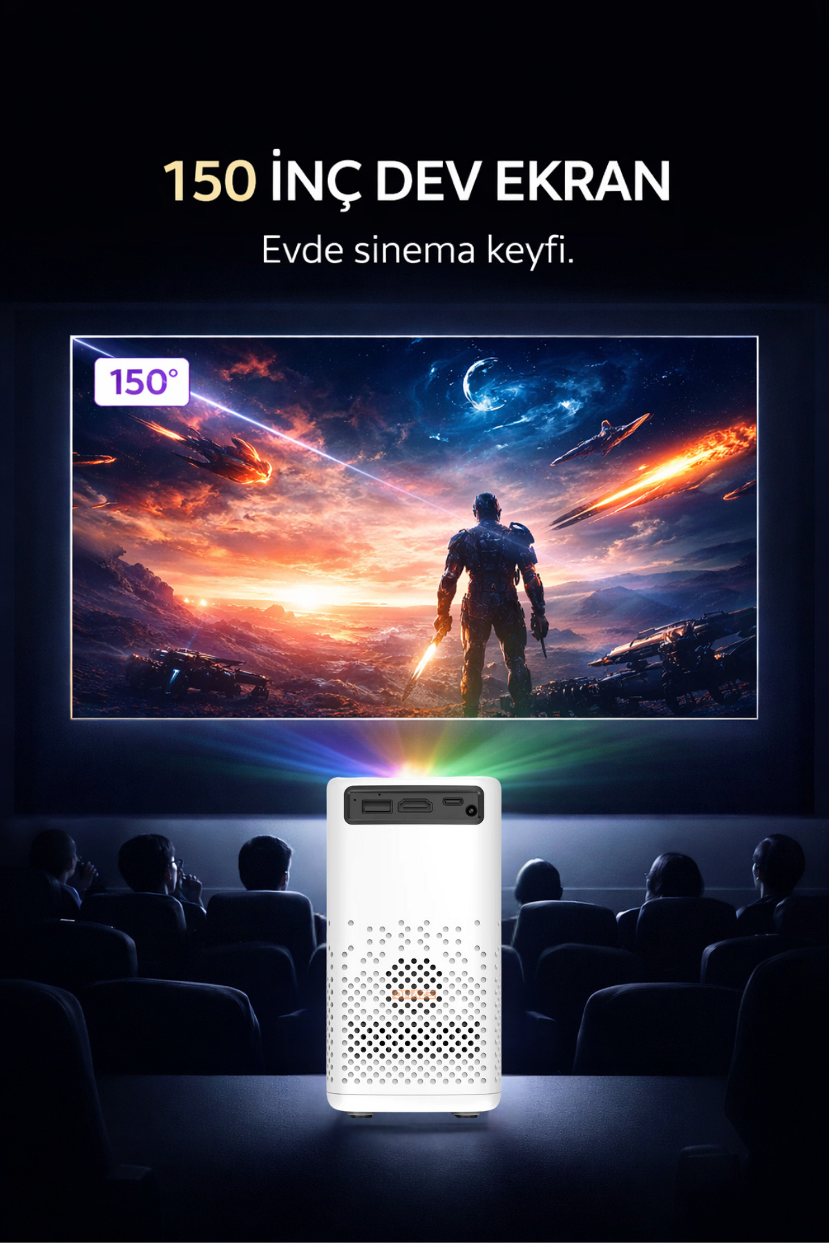 - Android 13 işletim sistemi ile donatılmış, taşınabilir ve şarj edilebilir yapısıyla her yerde sinema keyfi sunar.